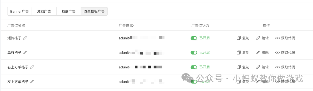 创建完广告之后,可以得到广告位ID,例如下方我创建了四个原生模版广告。