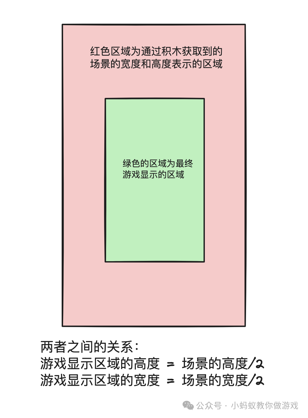 游戏显示区域的宽度和高度,与场景的宽度和高度存在如上的换算关系。因为原生广告会显示在游戏区域内,所以需要获取的屏幕高度 H 指的是游戏显示区域的高度,即场景高度/2。