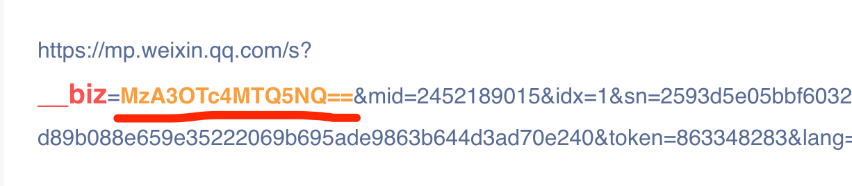 注意链接中的 biz= 后面的一段字符,这是您的公众号的唯一标识符,复制它。