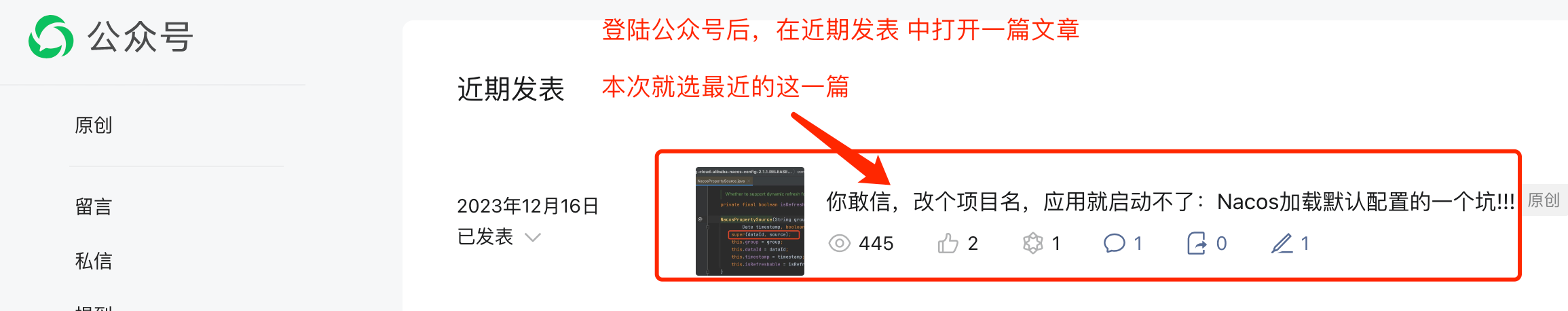进入公众号后台,在近期发表里,选中一条已群发或已发布的文章,右键复制链接地址。