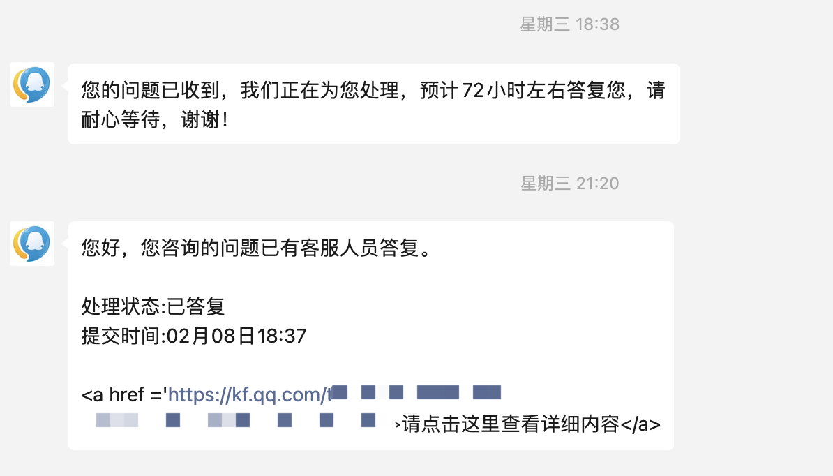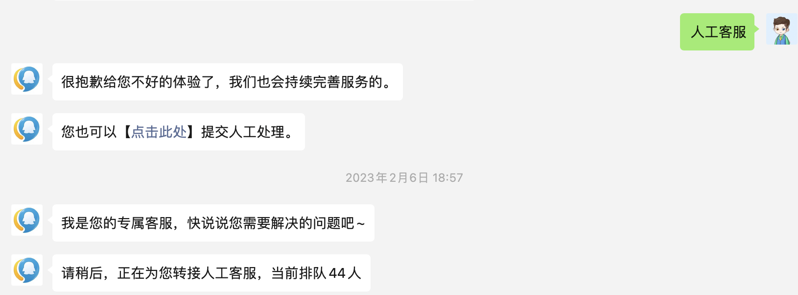 第二天同样的方式有人工客服回复了,等了差不多1个小时。