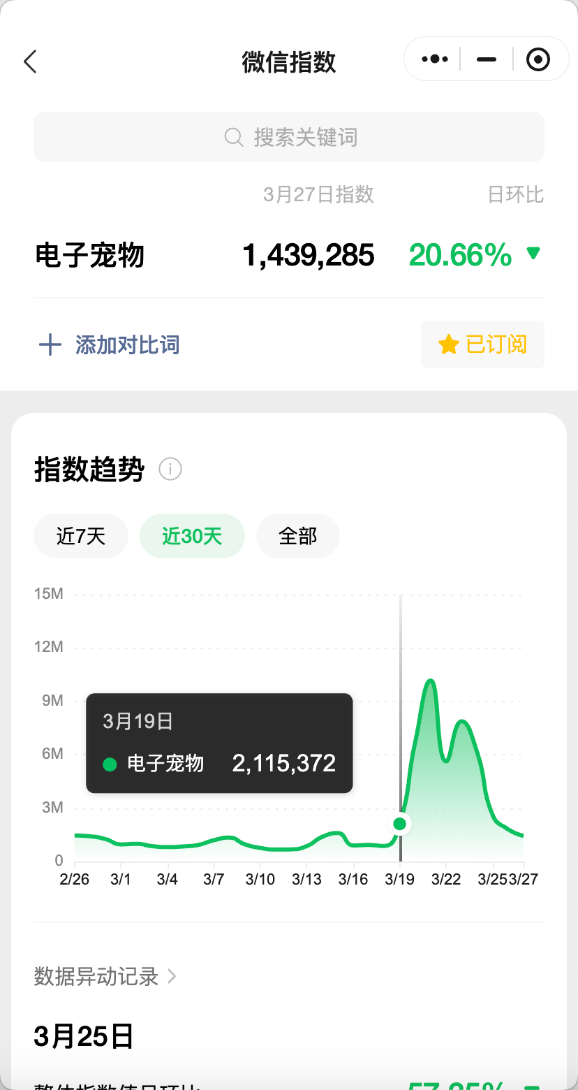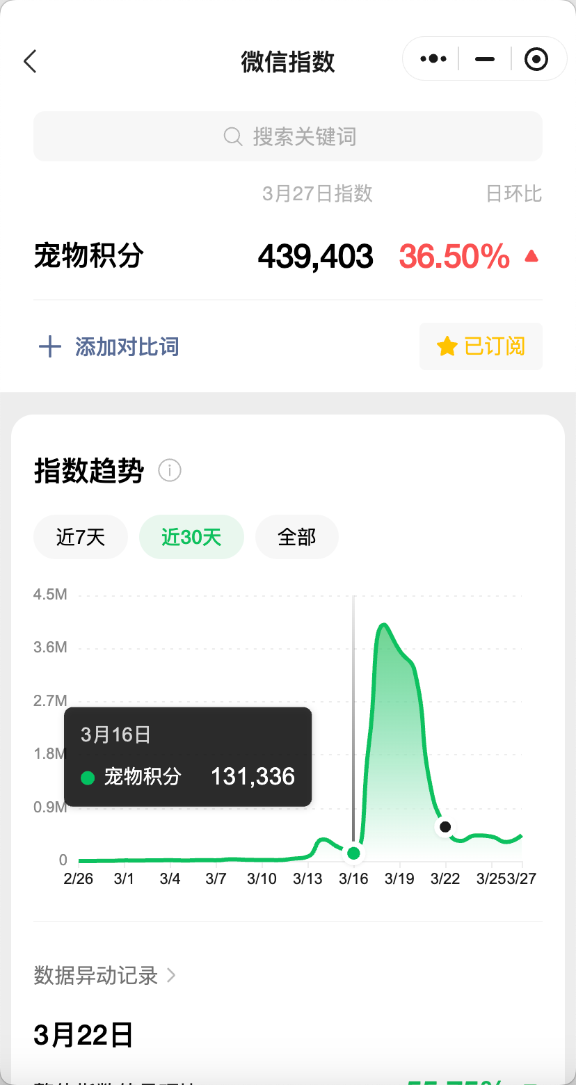后面的事情大家都想到了,越来越多的自媒体,短视频都来了,今年学校流行班级电子宠物,通过微信指数观察,2月28号,也就是开学那几天积分宠物这个关键词开始暴增,