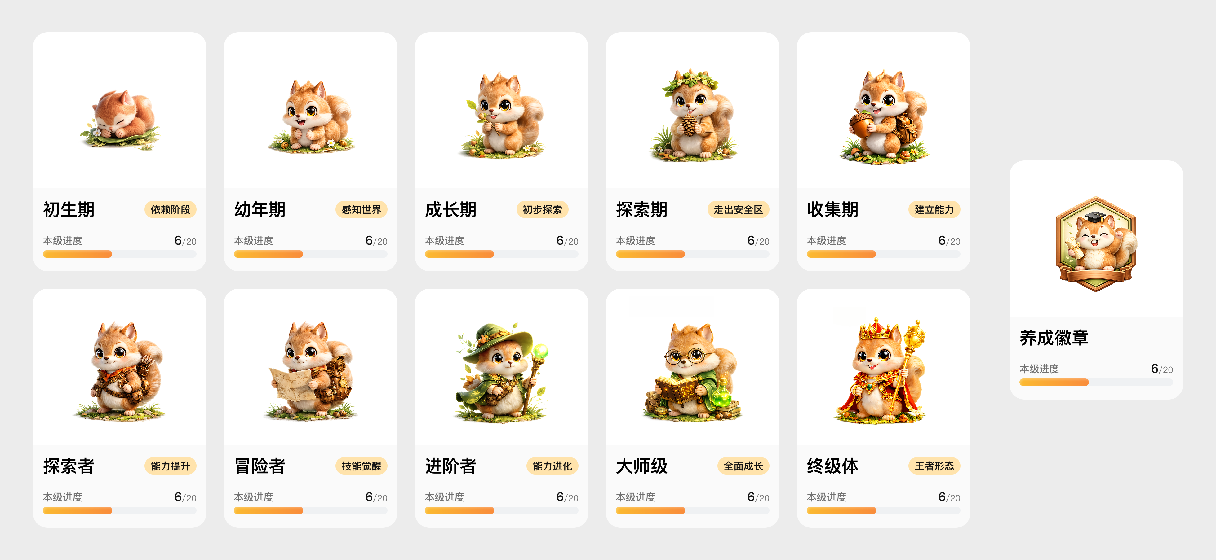 由于在公司的作品不能直接拿来用,当天就交付了两套宠物,是我比较喜欢的河狸和国宝熊猫,我把之前的葫芦娃系列改成这两套,每套宠物10个阶段,每个阶段10分,这样一个宠物成长需要100积分,宠物长大后可以领取对应的宠物徽章