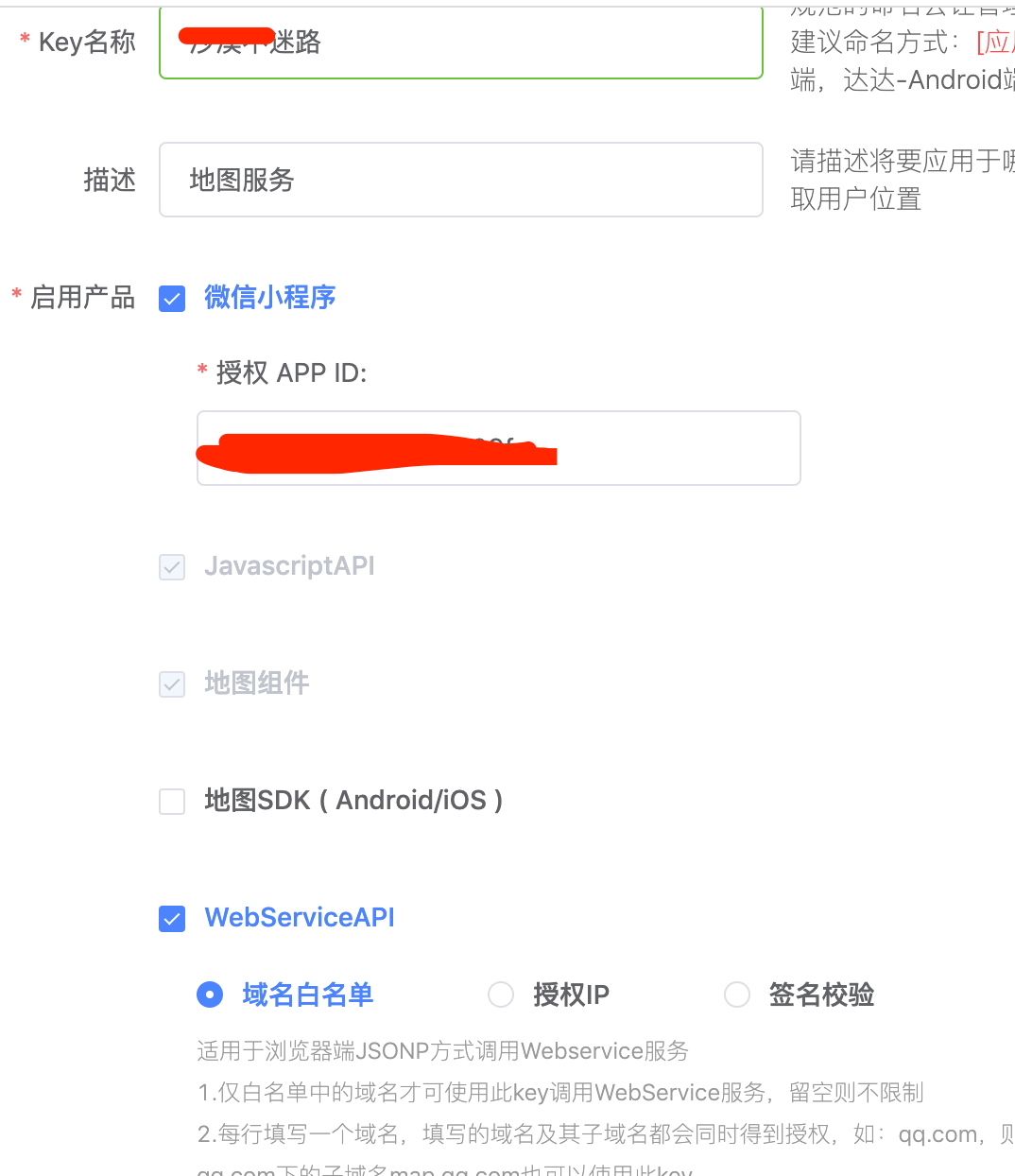 没有的话可以创建一个,反正也不要钱 @。@!,注意填写的appid是你项目用的appid,如果是测试,则勾选域名白名单即可,如果是正式项目,则需要在文本框里填写具体。