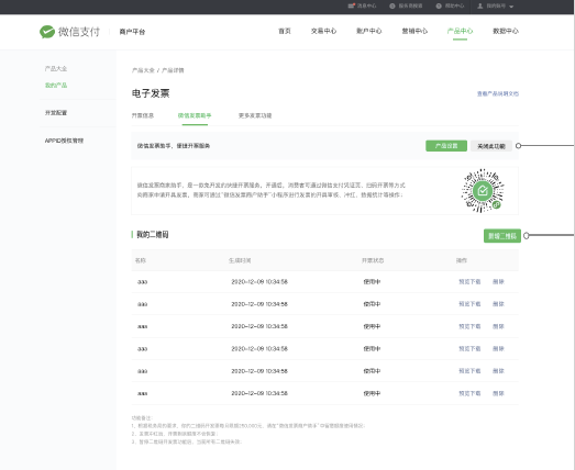启用后,根据需要分别配置两种开票途径【支付凭证开发票】和【二维码开发票】, 选择【支付凭证开发票】消费者可通过微信支付凭证作为入口申请开票;选择【二维码开发票】消费者可扫描开票二维码申请开票;在【二维码开发票】模式下,企业可创建多个开票二维码,点击【预览下载】自行下载打印,提供给消费者扫码开票