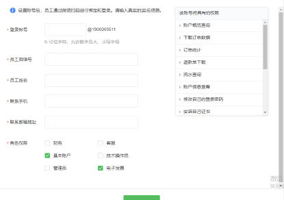 最后需要设置发票管理员工账号:点击【账户中心】—【员工账号管理】—【自定义】,“角色名称”可自定义,勾选“产品中心-管理电子发票”权限;