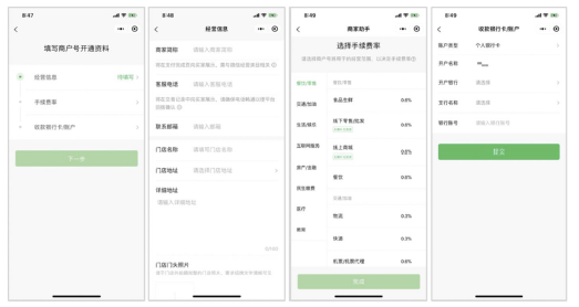 若商家主体资料审核通过,申请进展消息会通过公众号/服务通知推送至申请者微信号,请在线提交商家简称、门店照片、手续费率、结算账户等经营信息,等待平台审核。