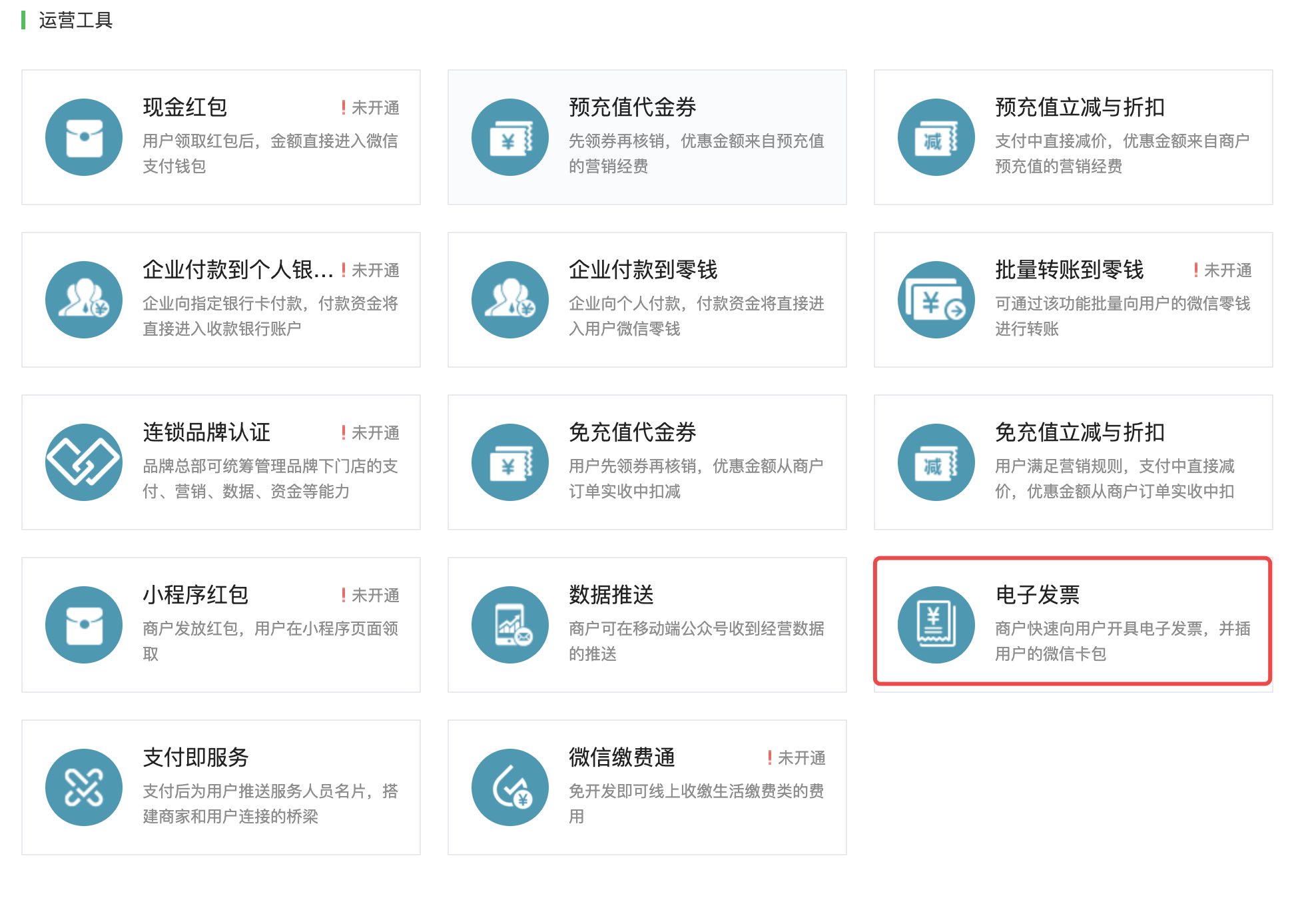 登录“微信支付商户平台”(https://pay.weixin.qq.com ),在【产品中心-运营工具-电子发票】进入: