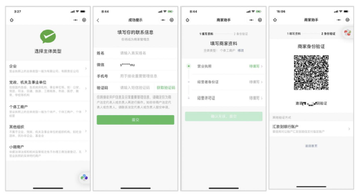 打开「微信支付商家助手」小程序 --> 登录页底部点击「成为商家」 --> 点击「立即成为商家」–> 「选择主体类型」–> 「填写商户号开通资料」 --> 点击「下一步」