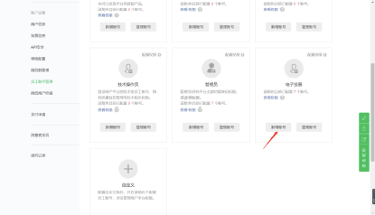 账号类型设置成功后,可进入设置好的角色,点击【新增账号】设置多个开票员,对应的微信号将拥有登陆“微信发票商户助手”审核开发票的权限;