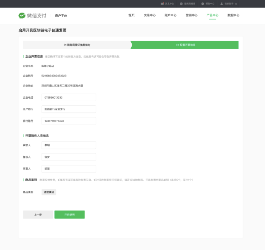 今天为大家介绍使用微信支付商户平台的纳税人如何开通区块链电子发票资格,实现消费者通过微信支付回执开票以及扫二维码开票功能。目前仅限深圳地区开通使用。