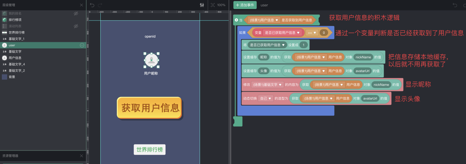 来看一下获取用户信息的积木逻辑,我们把它放在 user 精灵上。