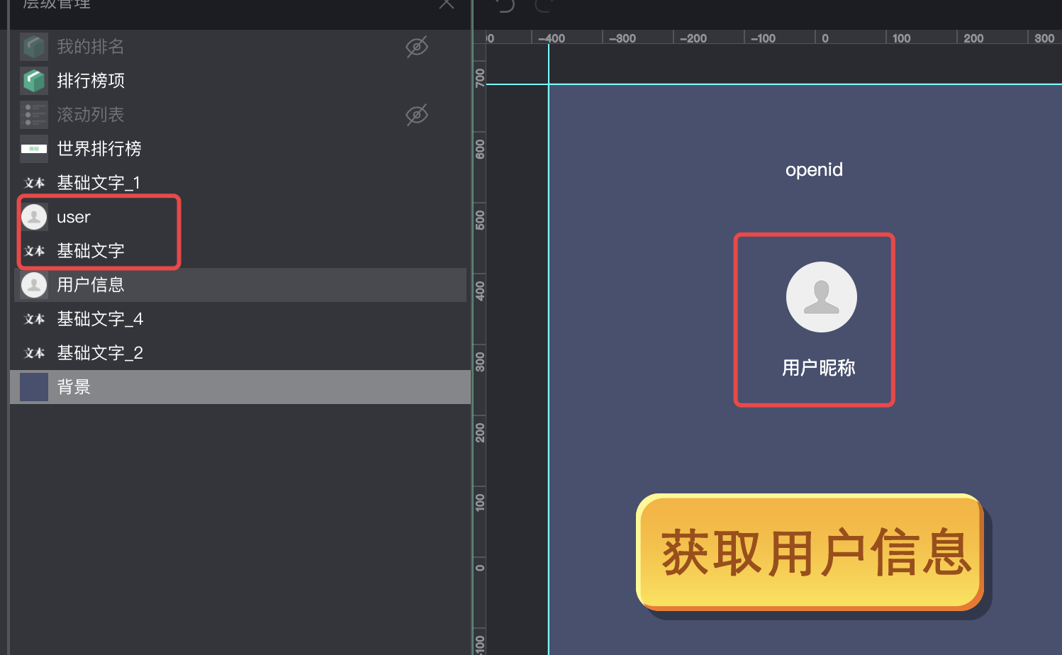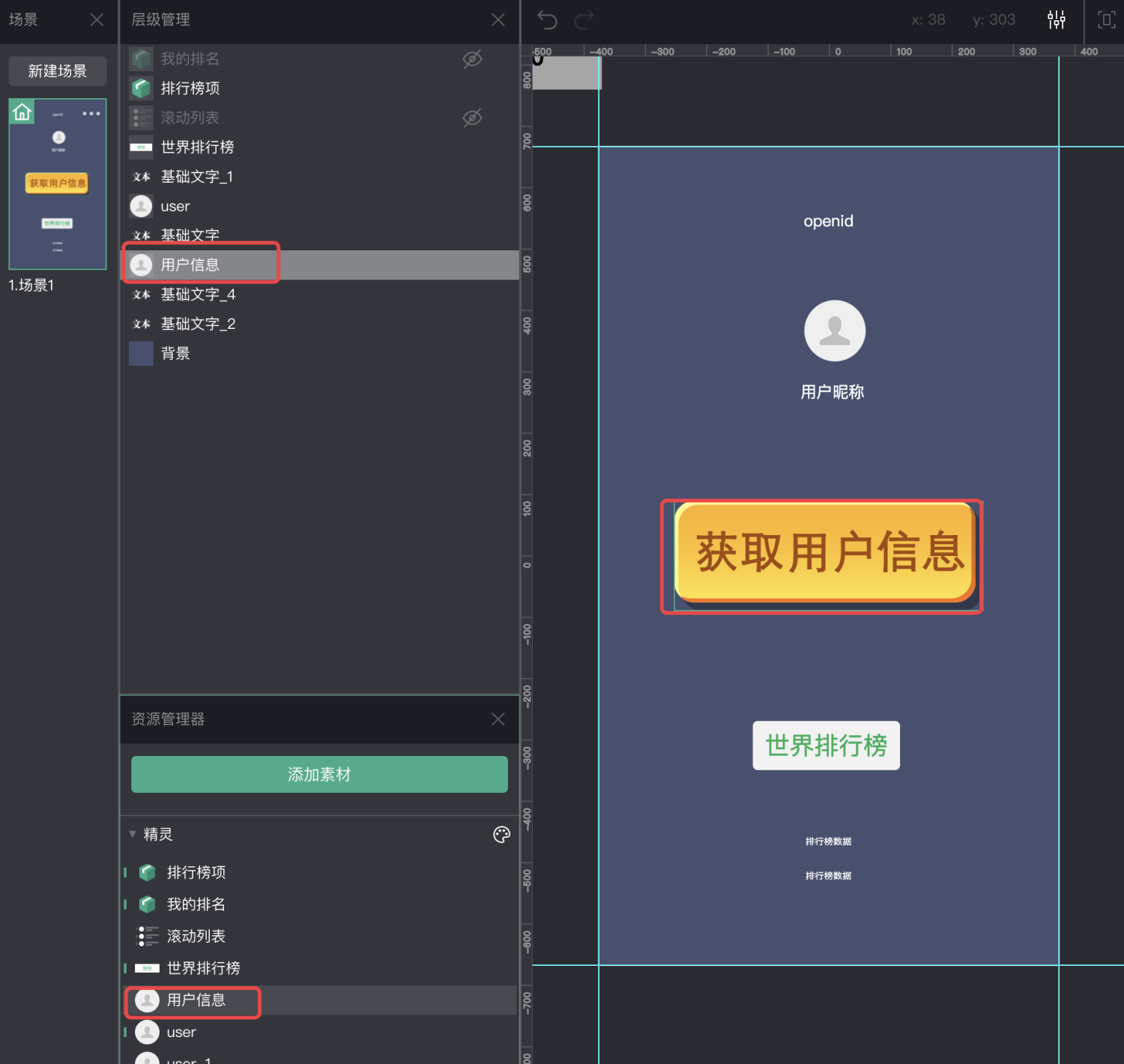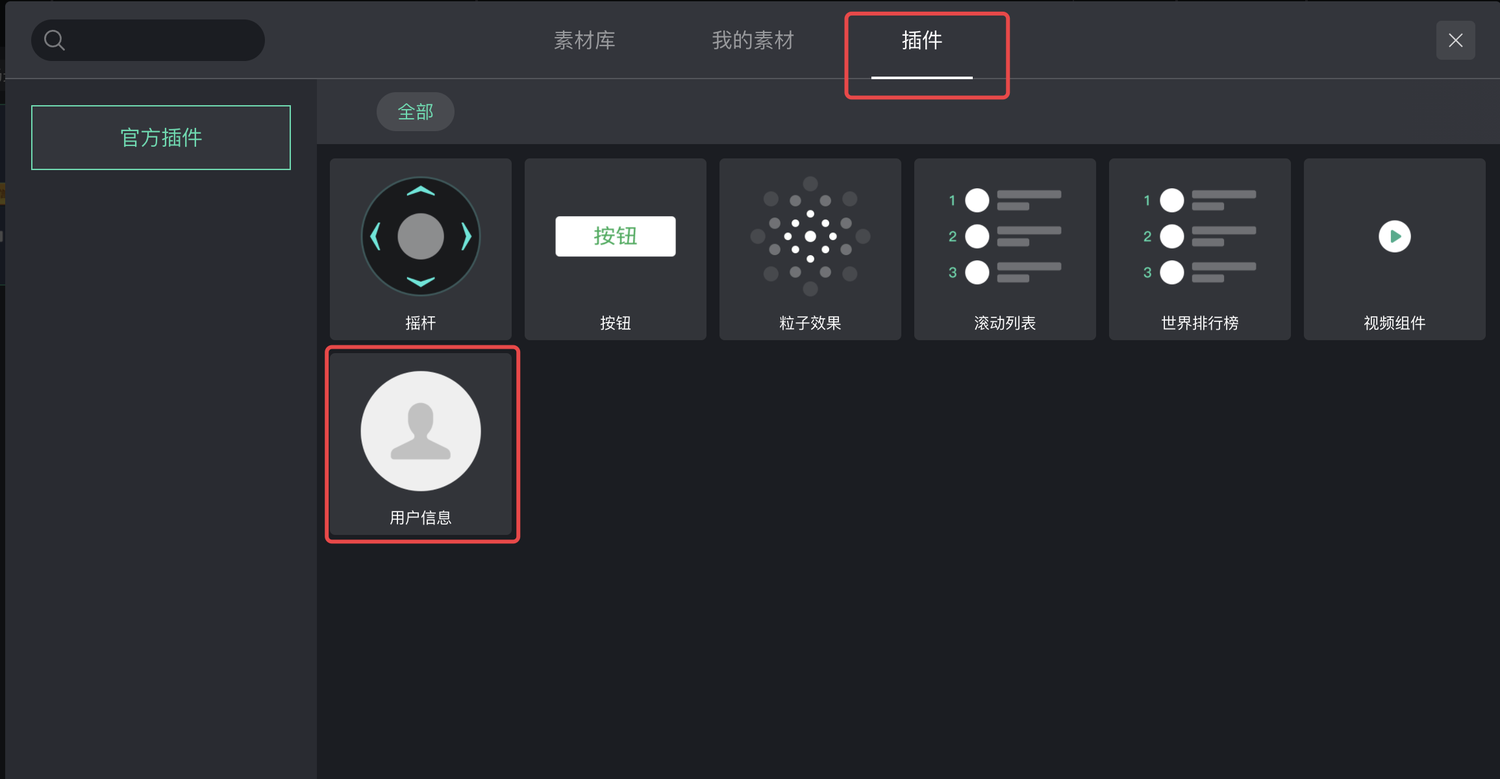 微信小游戏制作工具提供了“获取用户信息”的插件,位于素材库中“插件”中,选择这个插件导入到项目中。