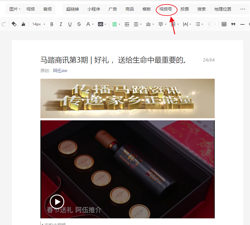 5、结合公众号来推广,如下图,在公众号发布推文时,可以选择插入视频号,然后可以添加自己在视频号发布过的视频作品。同时也可以加入视频号的二维码图片,增加视频号的曝光率。