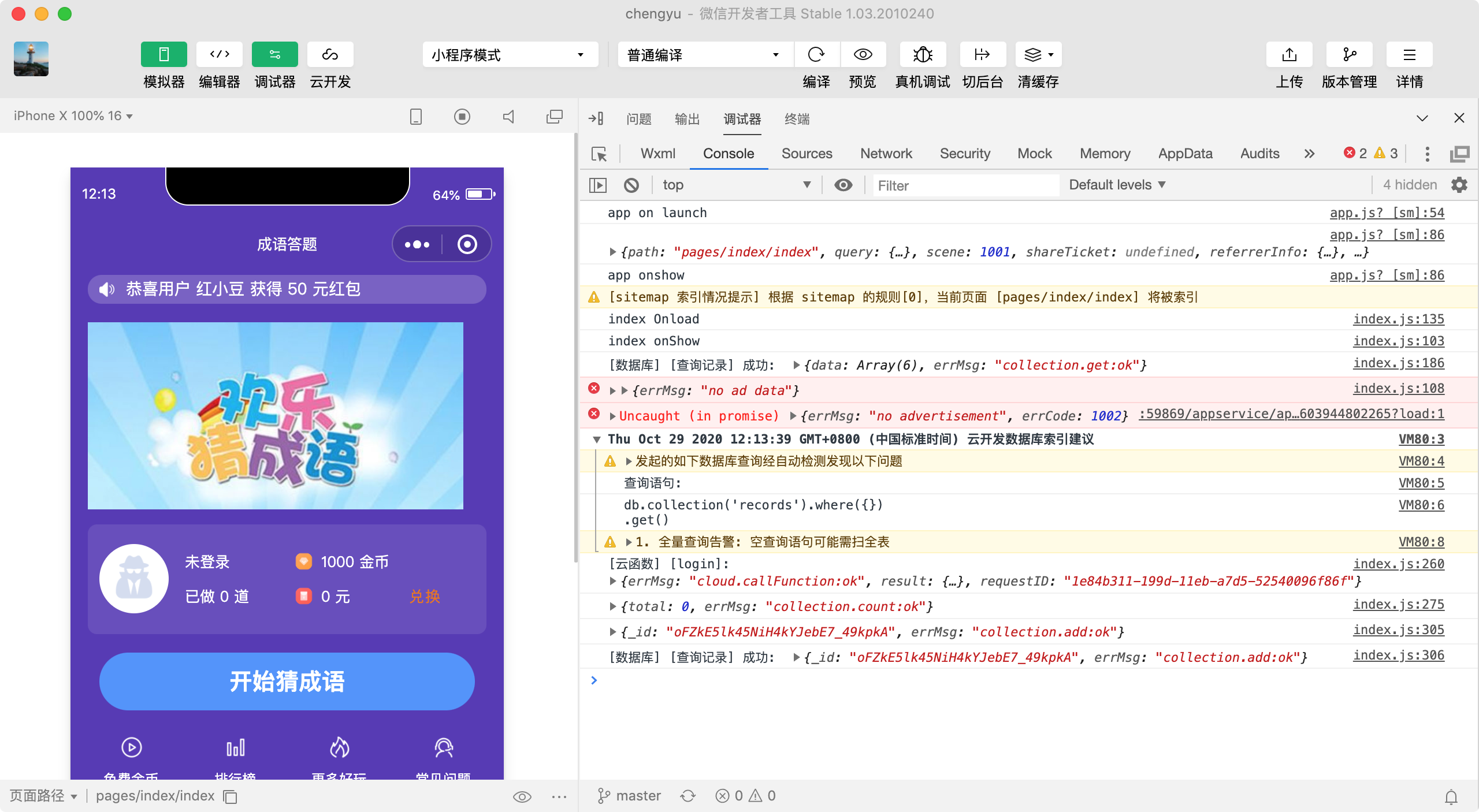3)小程序代码导入后,便可以看到小程序在微信开发者工具中的界面,如下图所示