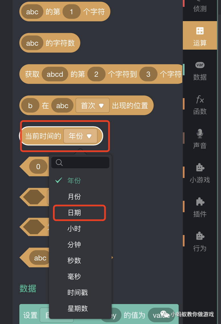 获取当前时间的积木块位于运算类型中。我们将使用当前时间的“日期”来进行今天还是明天的判断。