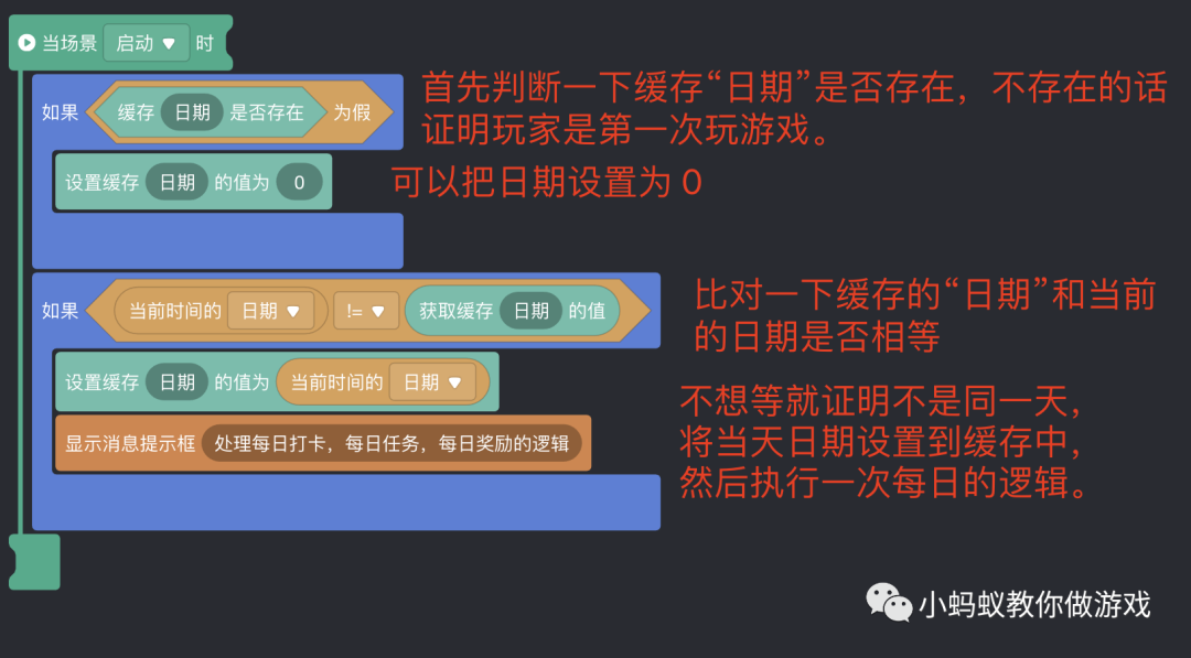 这个就是每日打开功能的实现原理了,其实非常的简单,利用获取当前日期,以及本地缓存积木即可实现。每次进入游戏的时候,就来看一下今天的日期,如果跟之前记录的不一样,就证明今天是崭新的一天啦!