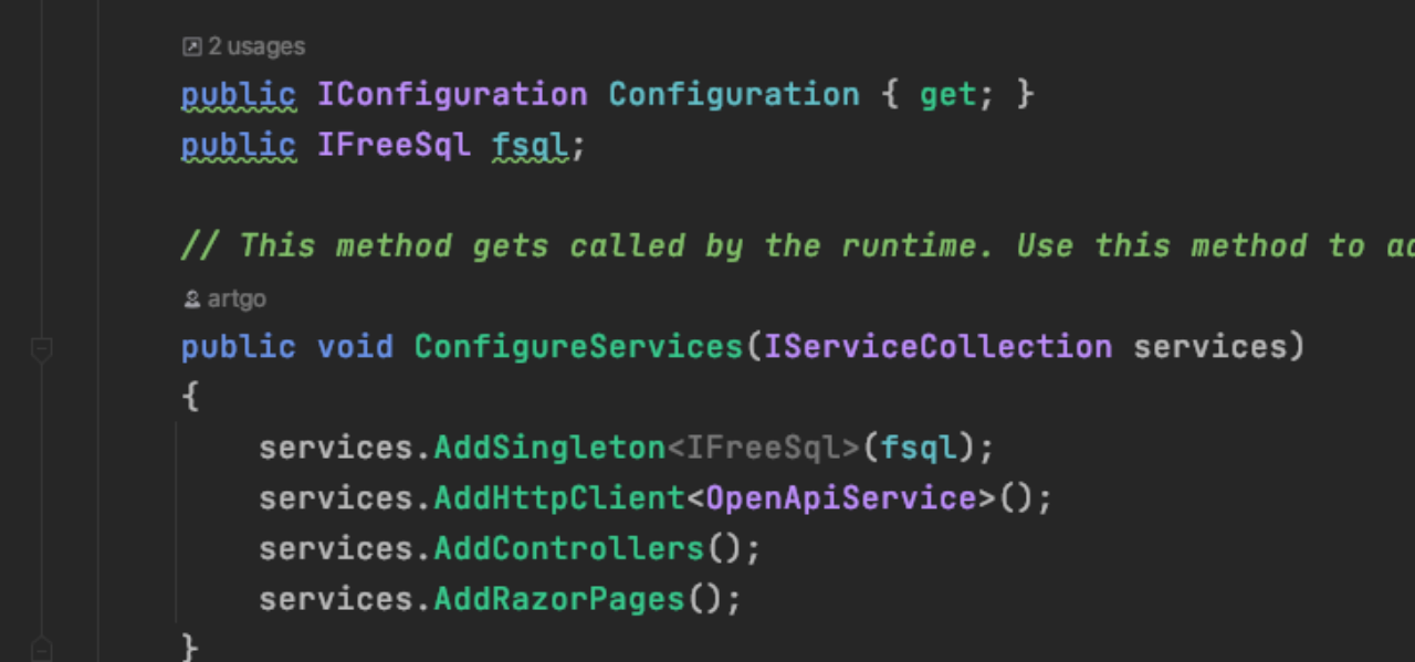 最后在ConfigureServices里面进行注入一下,注入方式为单例模式:services.AddSingleton<IFreeSql>(fsql)