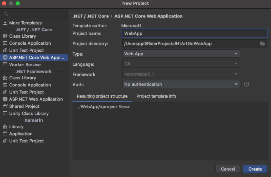 这里我创建一个.Net Core项目,选择WebApp模版。