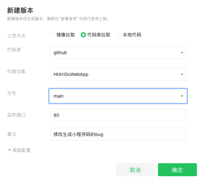 版本发布也是很方便的,定义好Dockerfile文件之后可以在腾讯云个人仓库构建配置那里配置从GitHub拉取或者本地构建好docker镜像后推送到腾讯云。我这里选择的是微信云托管代码拉取:
