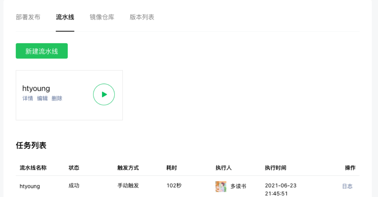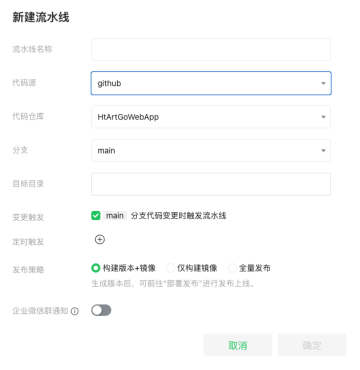 GitHub授权访问之后并在仓库中包含container.config.json文件,然后根据自己实际情况勾选其它配置以后这样一条流水线就定义好了,当代码推送触发main分支的时候就会自动构建镜像,构建好之后别忘了最后还要把最新版本部署发布,流水线不会自动帮你去将最新版本发布上去的。