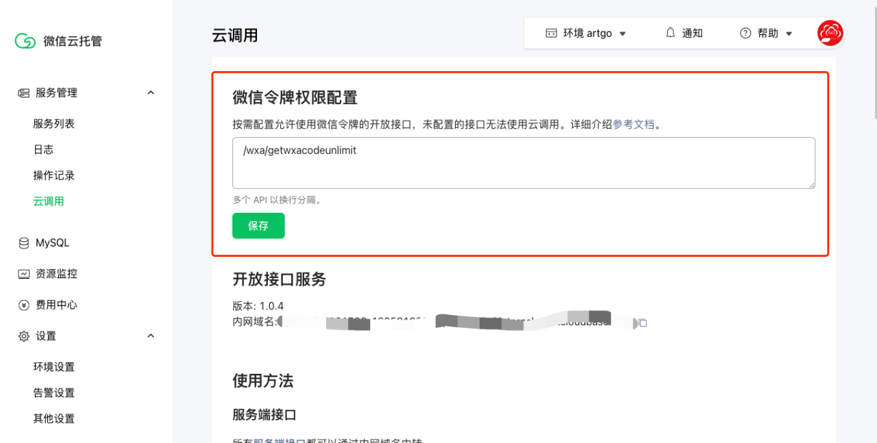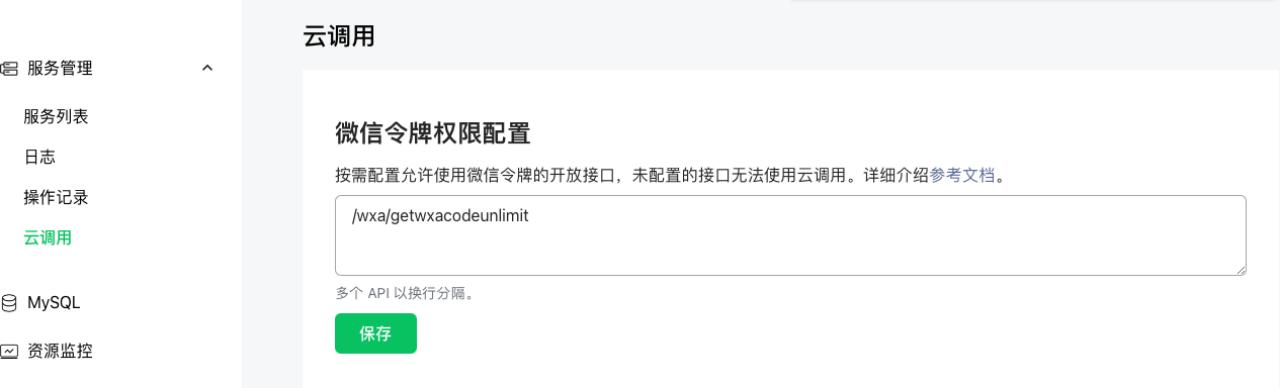 由于项目中需要使用到“云调用”获取小程序码的服务,所以这里安装一下微信云托管提供的OpenApi,这里一定要注意如果要使用“云调用”服务,微信令牌权限设置这里一定是要把要使用的接口先添加到白名单的。