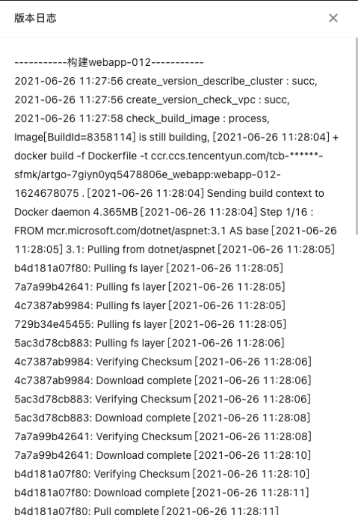 代码拉取之后会在微信云托管自动帮助我们构建镜像,点击查看日志就可以看到详细的构建过程,又是熟悉的操作。