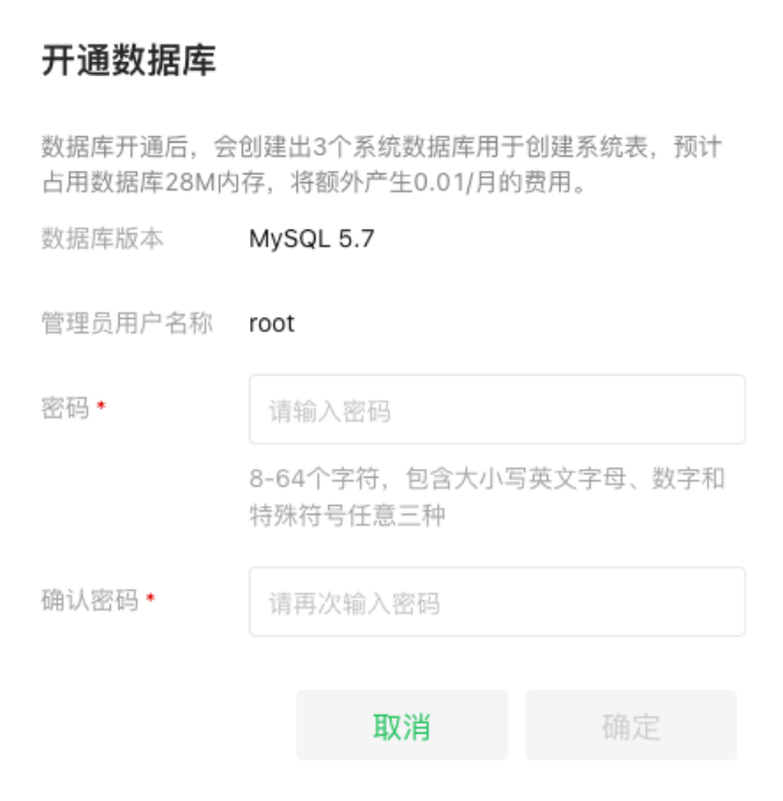 这次咱们也看看mysql,微信云托管相比之前增加了MySql服务,开通也是非常方便。如下图所示简单几步就可以开通成功了并且支持自动暂停: