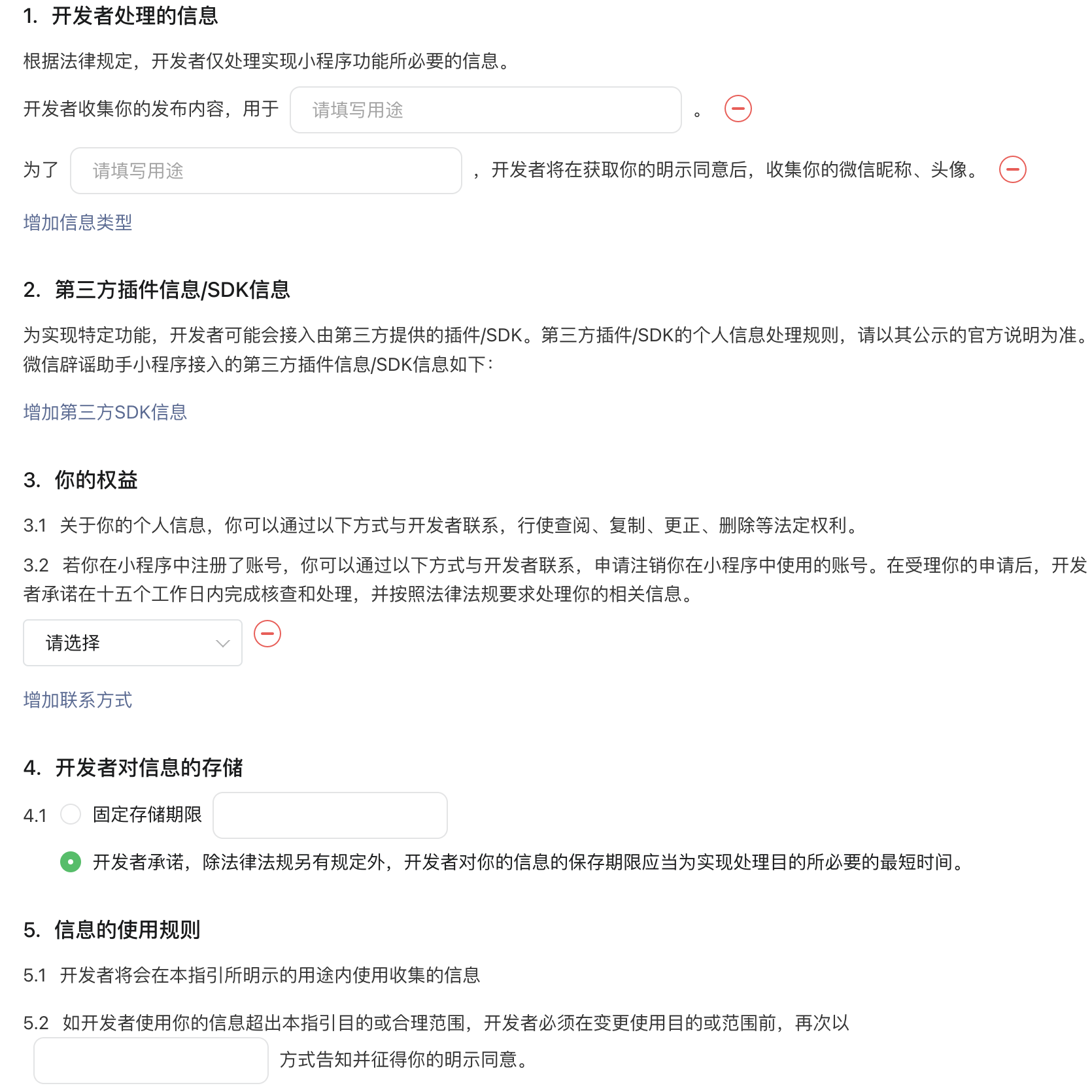只有在指引中声明所处理的用户个人信息,才可以调用平台提供的对应接口或组件。若未声明,对应接口或组件将无法调用成功。