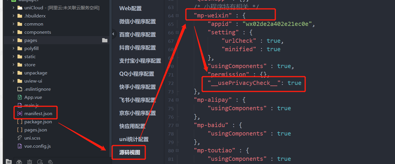 - app.json文件内这个配置__usePrivacyCheck__属性为true (uniapp开发参考下图)
