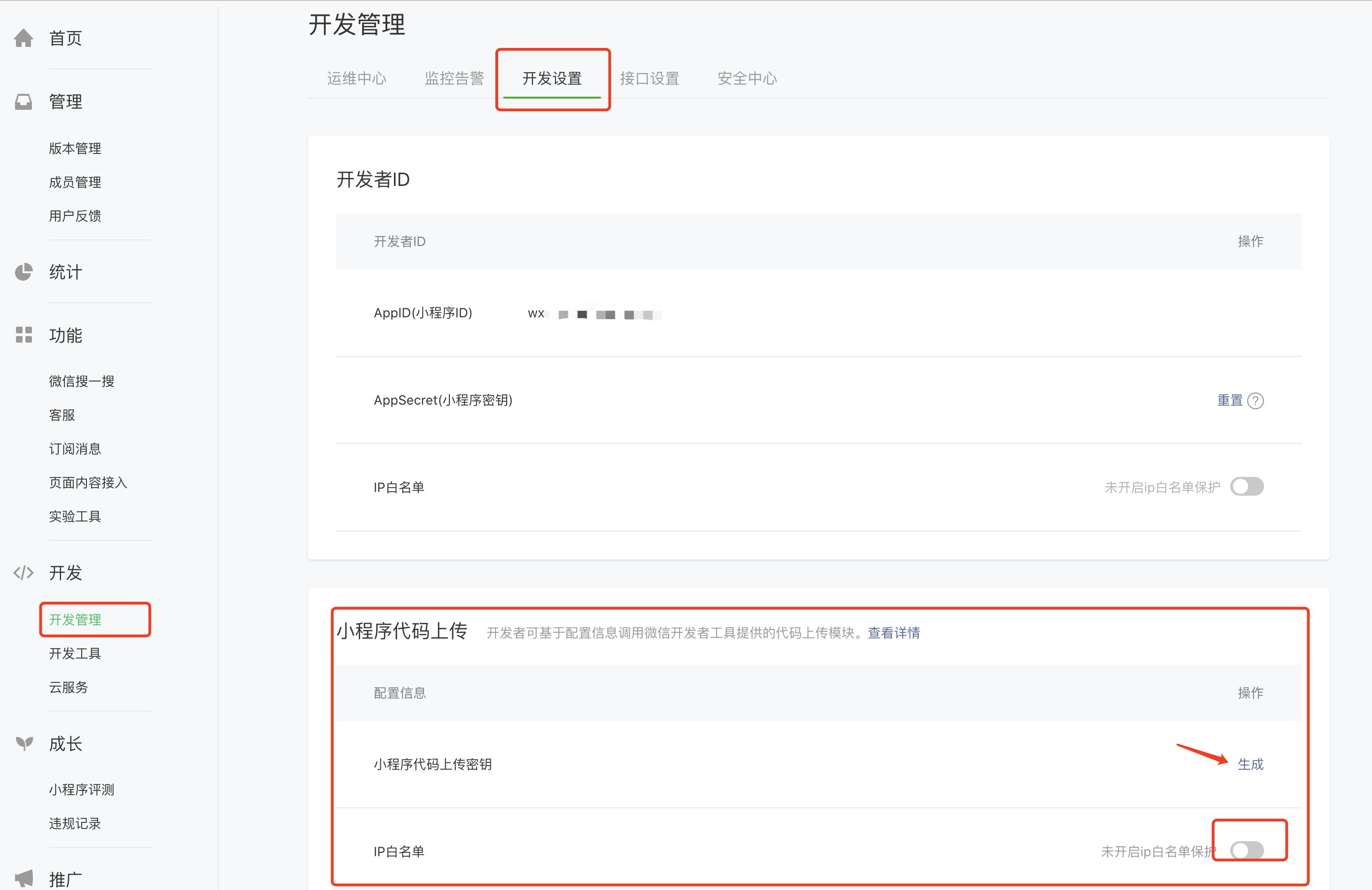 使用小程序管理员身份访问"微信公众平台-开发-开发设置"后下载代码上传密钥,并配置 IP 白名单。