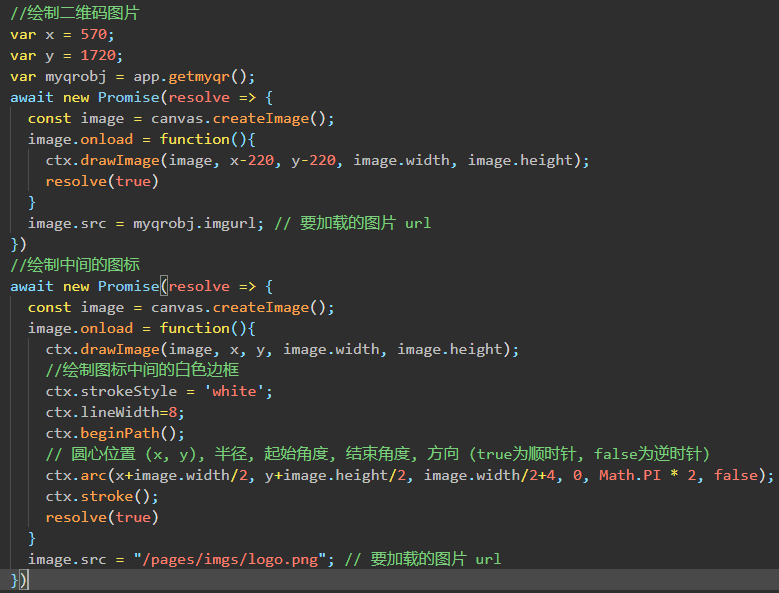 贴一段,绘制二维码,和中间图标,还有图标边缘的白色边框,没白色边框,感觉不好看。