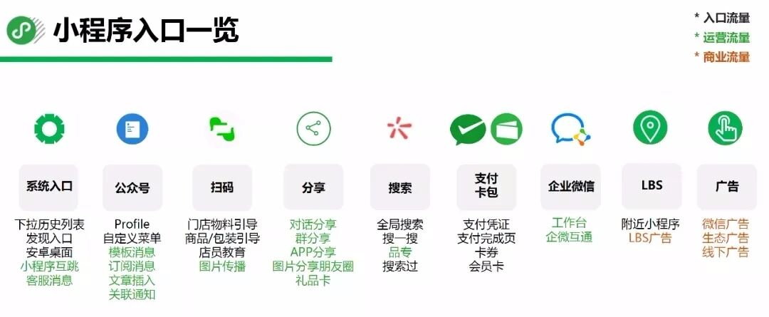 除了微信提供的入口流量以及广告的商业流量,商户自己也有自己的体系,可以辅助做自己流量的运营。