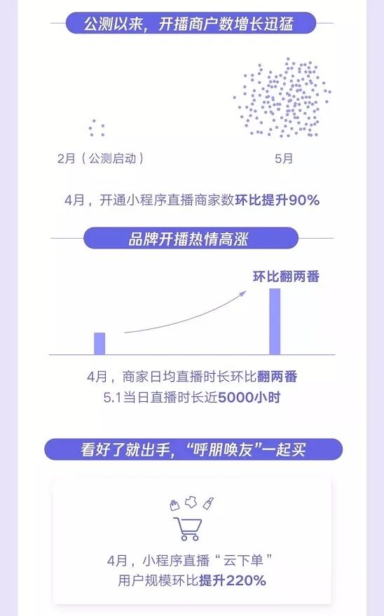 整个四月,品牌小程序直播的开通商户数是有近一倍的增长,用户下单规模也有非常快速的增长,环比增长了220%。