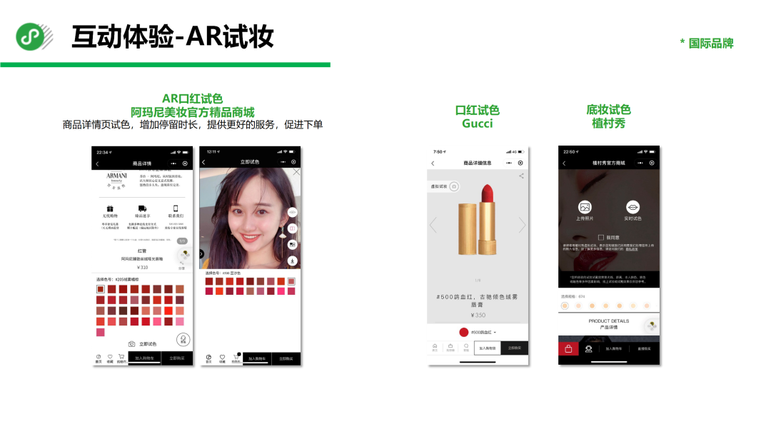 AR互动:大家去阿玛尼等口红小程序都可以体验到试色环节,因为试色其实是彩妆里的痛点,我不想去线下,也不想脱口罩,线上试色可以提升用户的转化意向,我们现在也有像底装试色、眉毛试妆等等小程序互动体验。