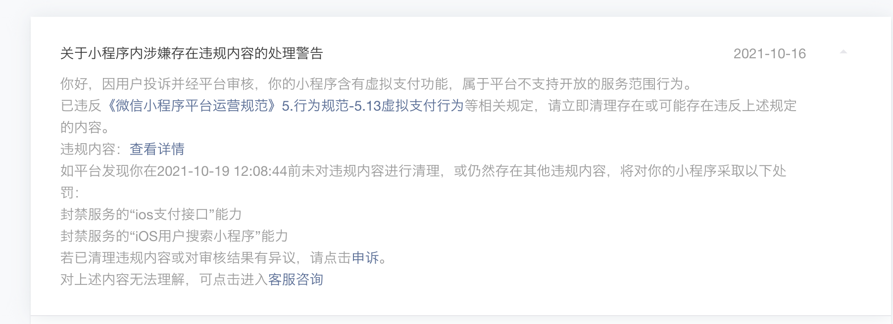 已违反《微信小程序平台运营规范》5.行为规范-5.13虚拟支付行为等相关规定,请立即清理存在或可能存在违反上述规定的内容。