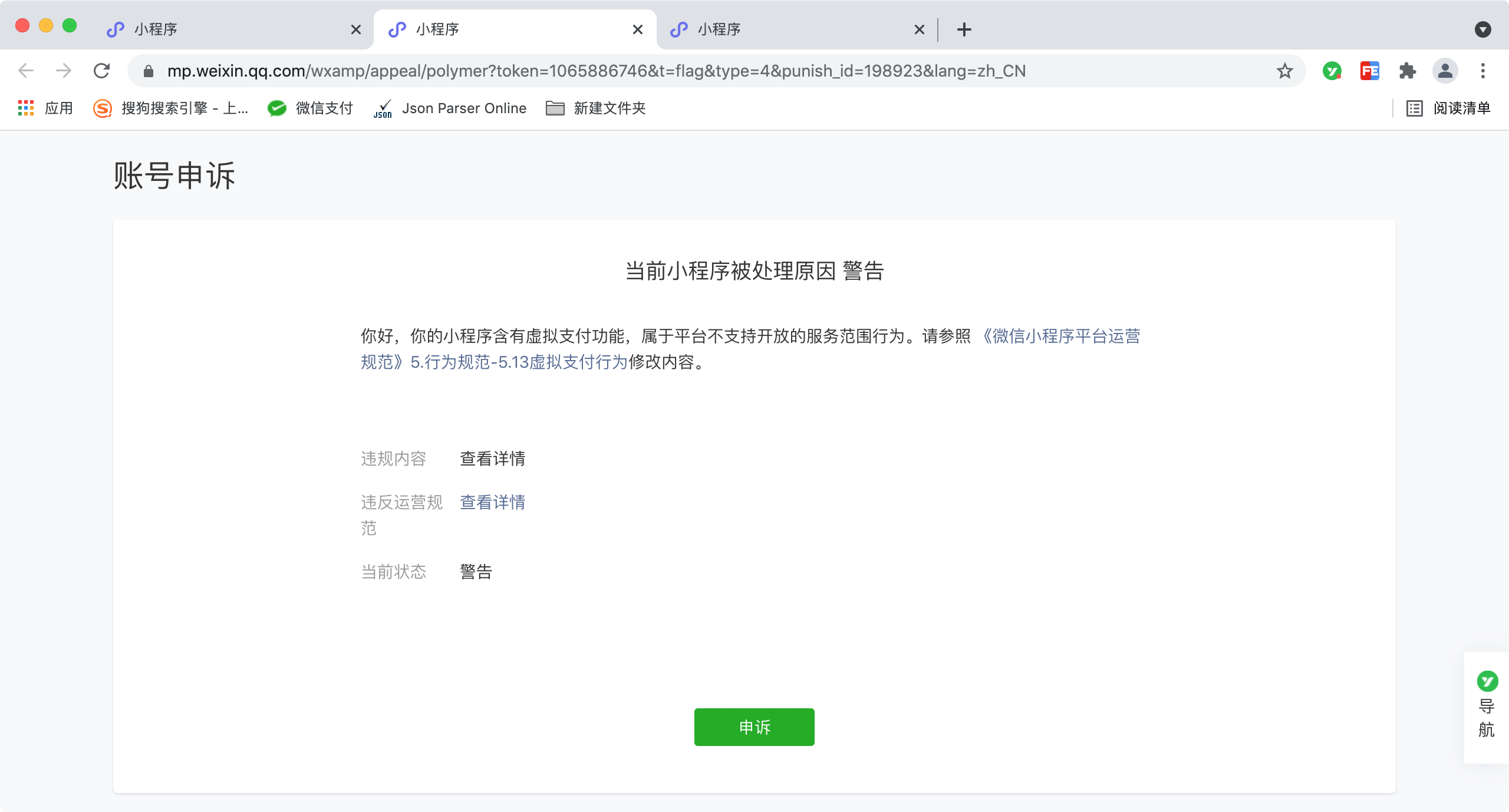 关于小程序内涉嫌存在违规内容的处理警告