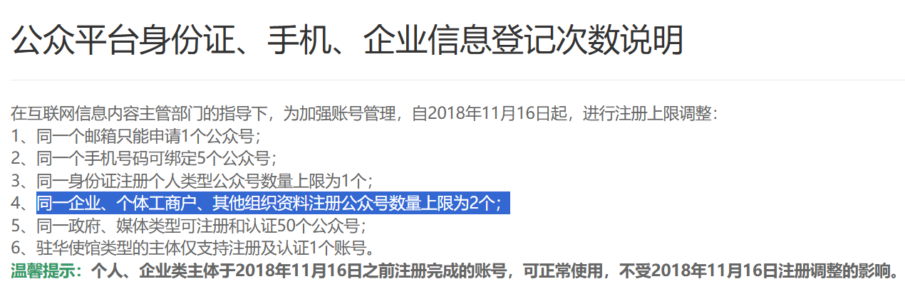 6.微信官方关于 公众平台身份证、手机、企业信息登记次数说明 在哪里?
