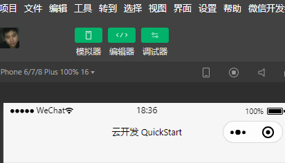 3)点击新建后,便可以看到小程序在微信开发者工具中的界面,如下图所示,该界面是云开发的模板项目