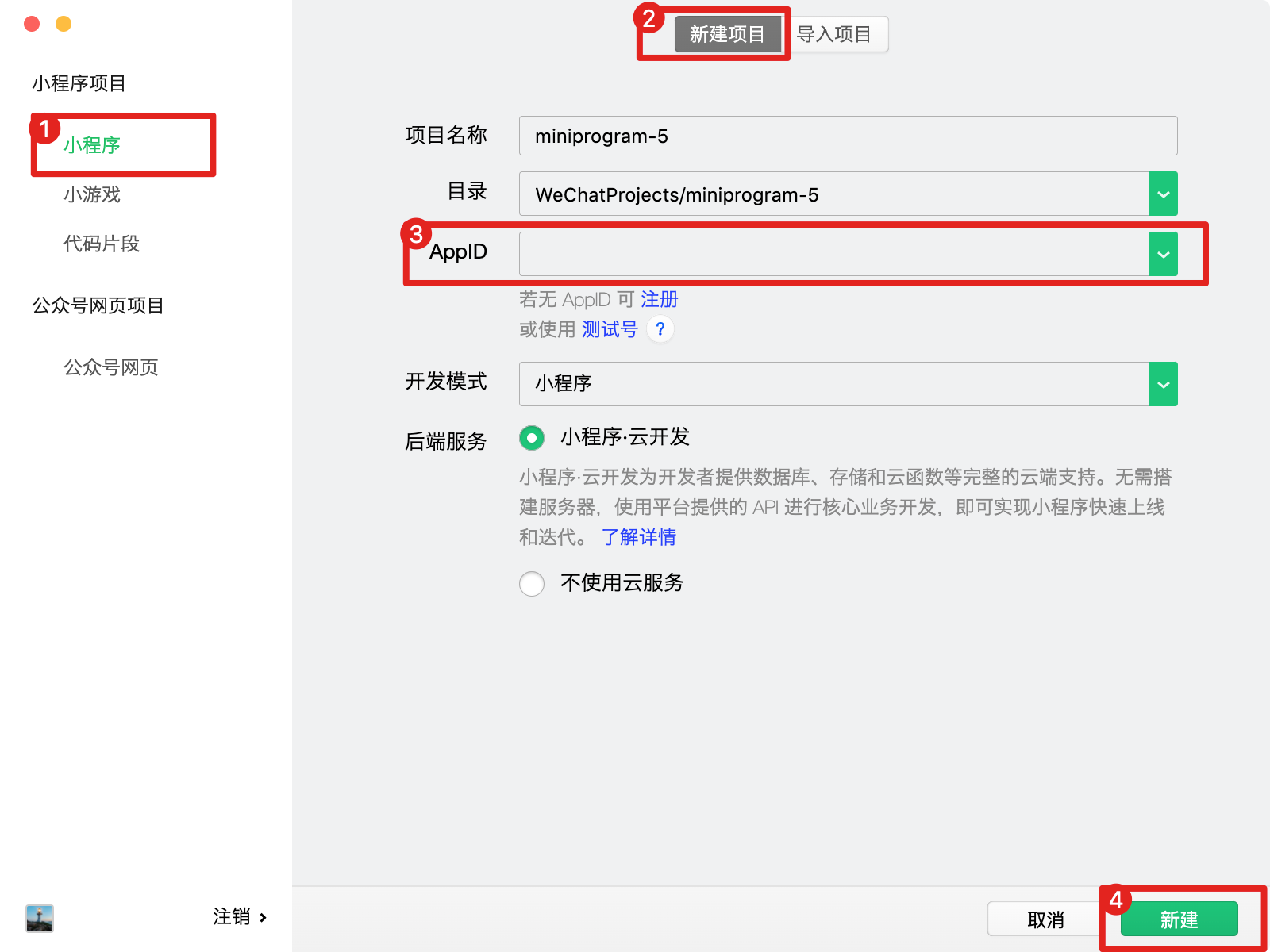 其中第三步需要填写小程序对应的appid,点第四步新建