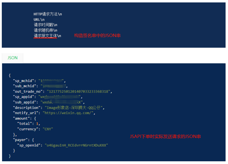 3.3.检查构造签名串时的JSON串中的参数和实际发送请求时JSON串中的参数是否一致(当请求方法为POST或PUT时,需使用真实发送的JSON报文,所以下方截图以JSAPI下单举例)