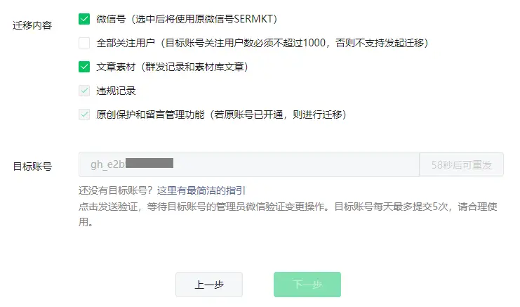 目标账号信息:同上,填写拟接收迁移内容的公众号信息。