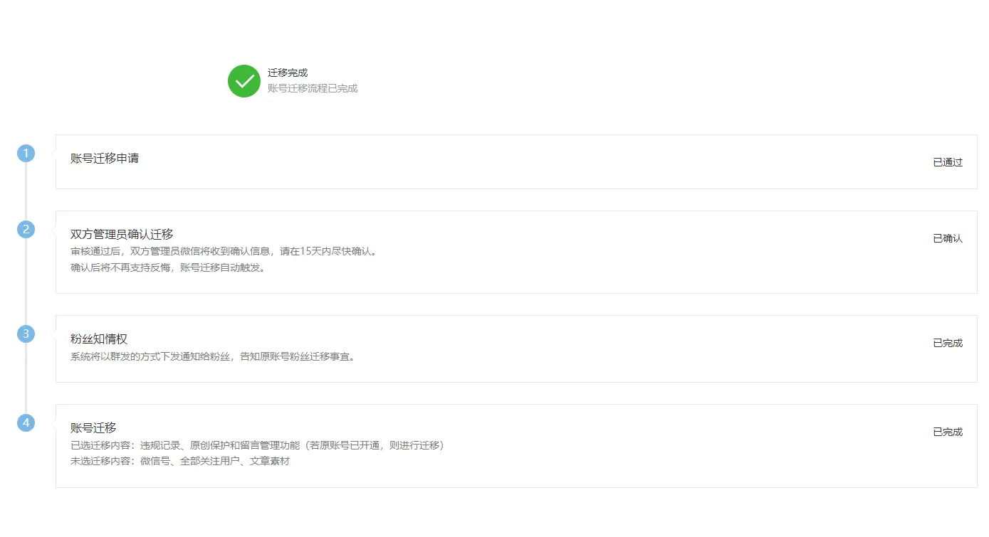 第十二步:迁移完成-粉丝在1天内无取关则自动迁移成功,原公众号将被冻结回收,所有数据(粉丝、素材等)并入新号。