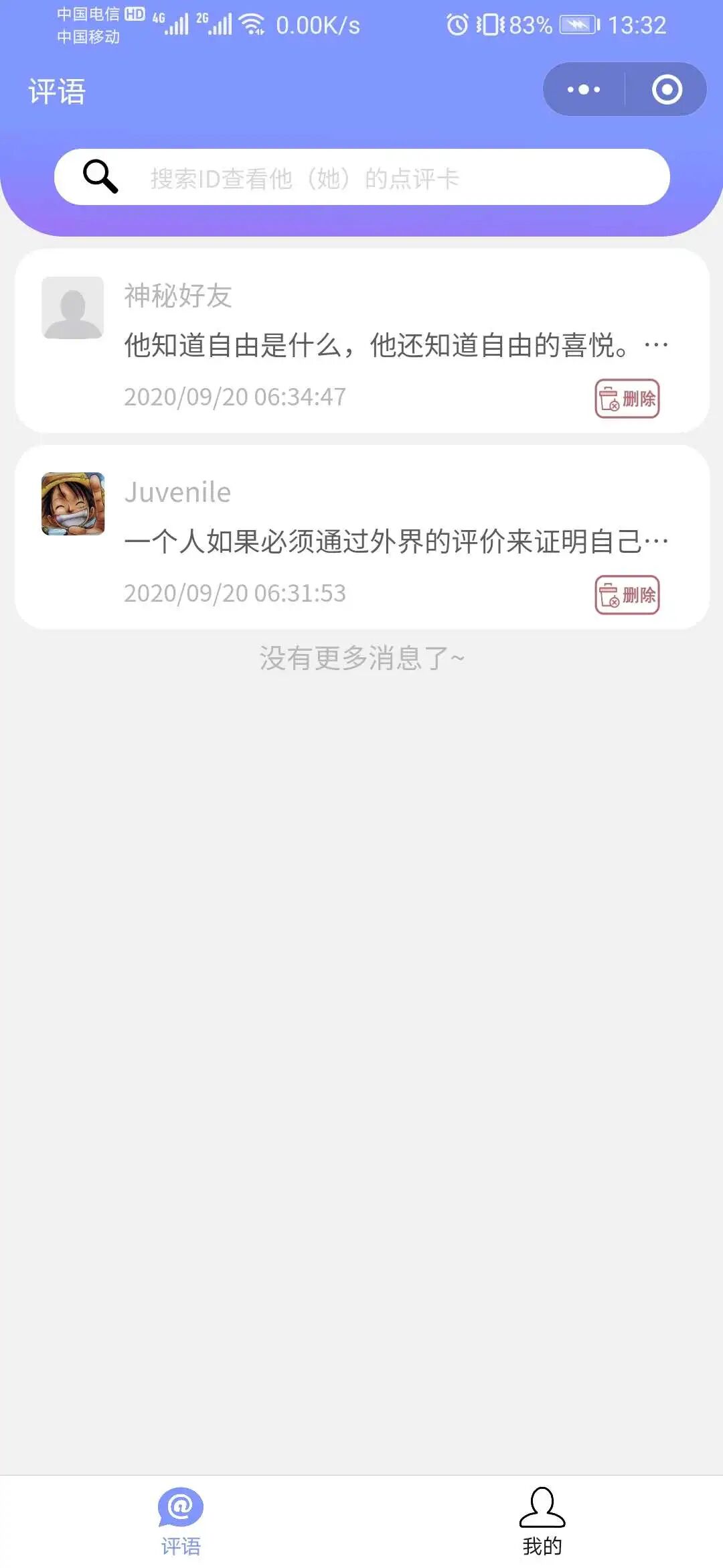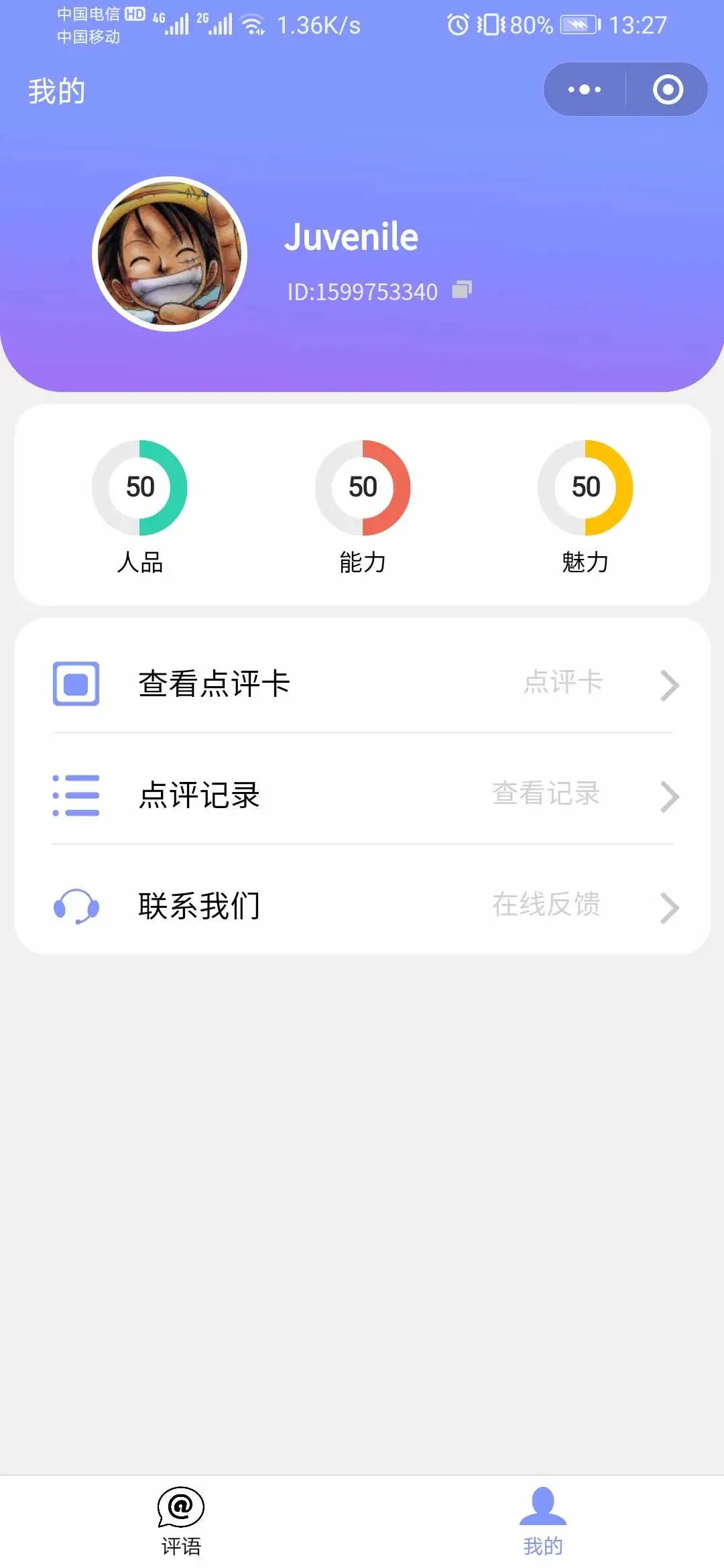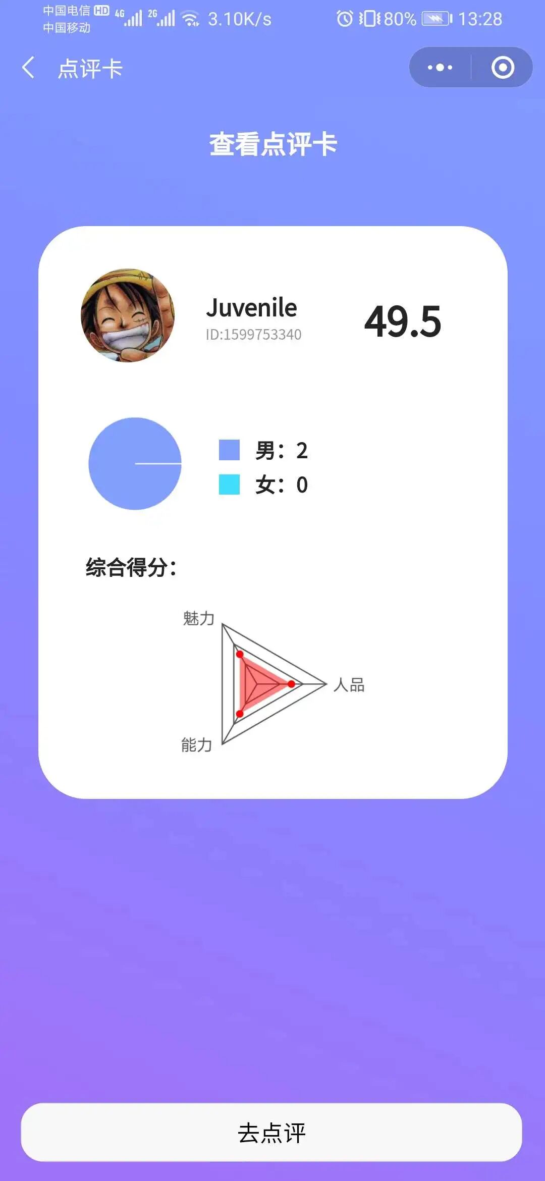 用户授权登录会自动生成一个唯一ID,可通过搜索好友的ID号查看别人对他(她)的评分,或对好友进行点评,可选实名或匿名,每次点评会更新上次的评分,评语不会覆盖