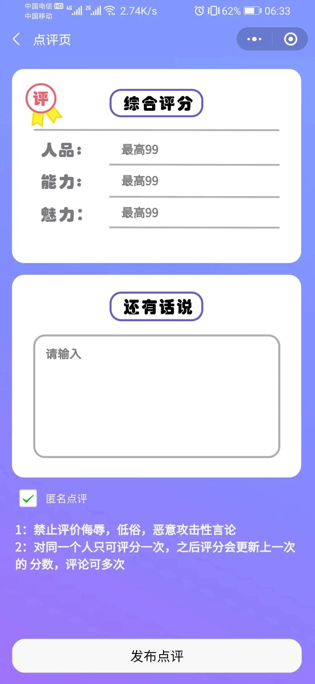 适用于工作生活中的各个场景,可匿名对好友表达对他(她)的不满并给出评分,对于新加的陌生好友,可通过查看别人对他(她)的评分对他(她)有个基本认识,避免交友不慎,也可通过好友对自己的点评了解自身不足,更好的改进自身不足。
