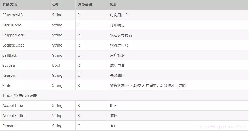5)JSON返回示例//没有物流轨迹的{“EBusinessID”: “1109259”,"Traces":[],“OrderCode”: “”,“ShipperCode”: “SF”,“LogisticCode”: “118461988807”,“Success”: true,“Reason”: null}//有物流轨迹的{“EBusinessID”: “1109259”,"OrderCode":"",“ShipperCode”: “SF”,“LogisticCode”: “118461988807”,“Success”: true,"CallBack":"",“State”: 3,“Reason”: null,"Traces":[ { "AcceptTime": "2014/06/25 08:05:37", "AcceptStation": "正在派件..(派件人:邓裕富,电话:18718866310)[深圳 市]", "Remark": null }, { "AcceptTime": "2014/06/25 04:01:28", "AcceptStation": "快件在 深圳集散中心 ,准备送往下一站 深圳 [深圳市]", "Remark": null }, { "AcceptTime": "2014/06/2501:41:06", "AcceptStation": "快件在 深圳集散中心 [深圳市]", "Remark": null }, { "AcceptTime": "2014/06/24 20:18:58", "AcceptStation": "已收件[深圳市]", "Remark": null }, { "AcceptTime": "2014/06/24 20:55:28", "AcceptStation": "快件在 深圳 ,准备送往下一站 深圳集散中心 [深圳市]", "Remark": null }, { "AcceptTime": "2014/06/25 10:23:03", "AcceptStation": "派件已签收[深圳市]", "Remark": null }, { "AcceptTime": "2014/06/25 10:23:03", "AcceptStation": "签收人是:已签收[深圳市]", "Remark": null }] |