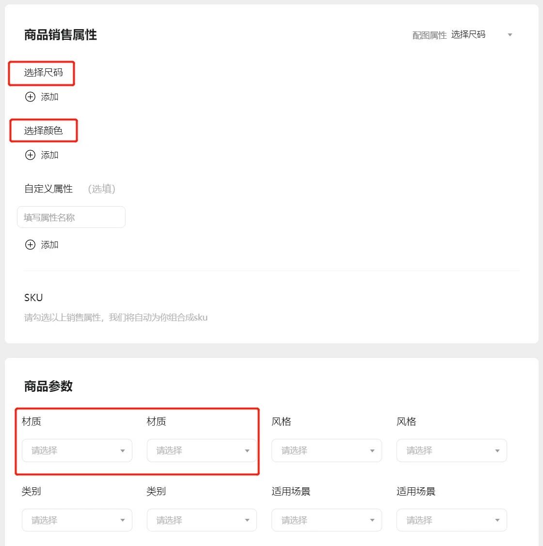 - 选择的分类后想要添加商品,销售属性中,尺码、颜色为必填项,但是这个商品与这两个属性关联并不是太大;