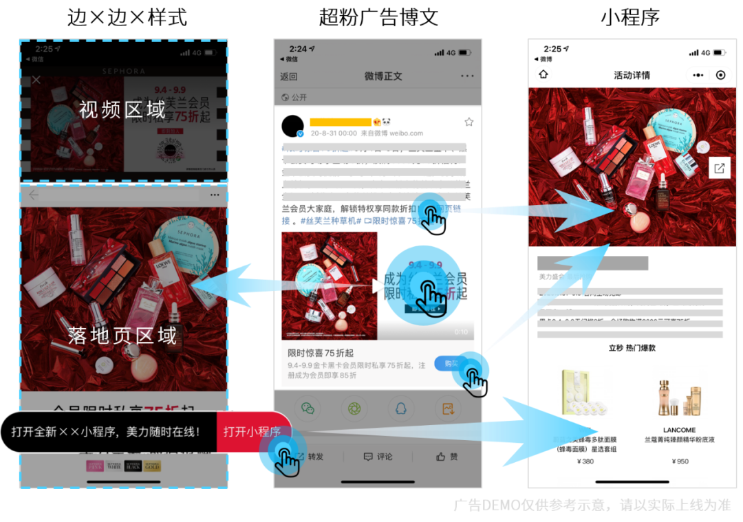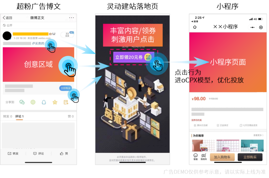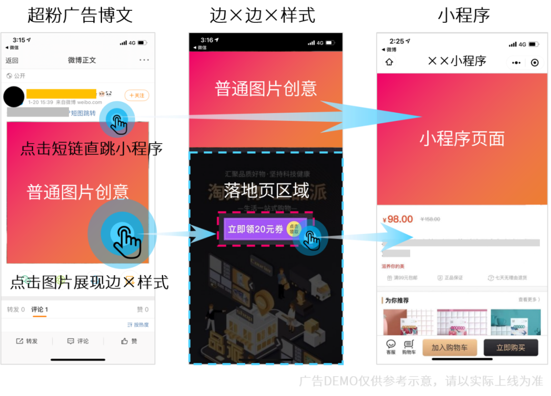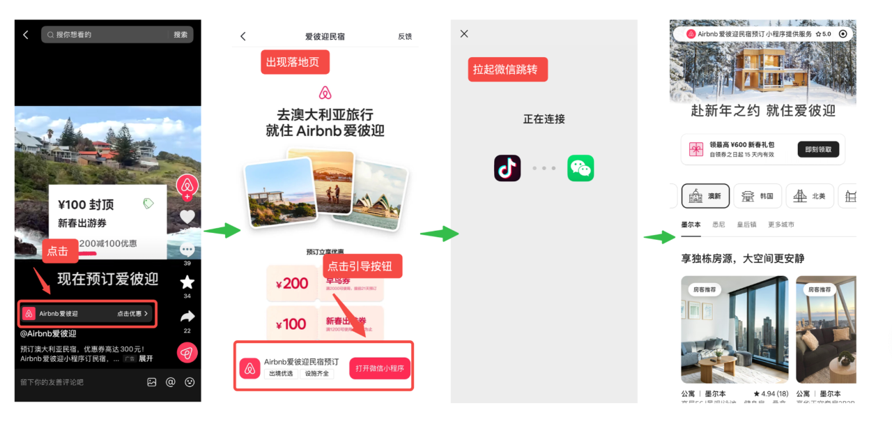 - 展示路径:点击广告位 → 唤起落地页 → 出现引导按钮 → 拉起微信小程序