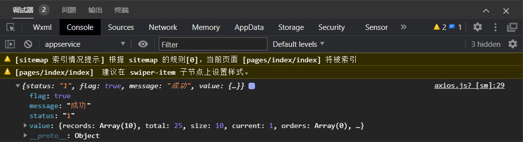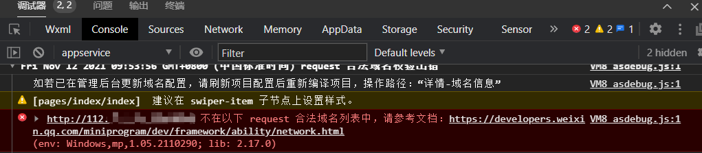 其实一开始封装完axios请求后测试请求数据时会出现请求地址不在request合法域名列表中,后来查看文档发现需要进行服务器域名的配置,但在小程序工具里找了好久没有发现服务器域名配置,就先采用了一个简单粗暴的方式: