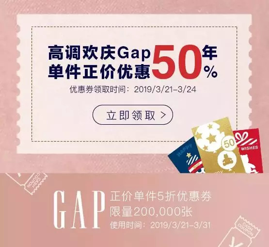3月底,GAP开展了针对一二线城市的第一场店庆活动。GAP作为快时尚巨头之一,在一二线城市已经有着发达的门店网络。在活动中,GAP选择将线上流量导入线下,大量派发限门店使用的优惠券,以此带动门店进店率。